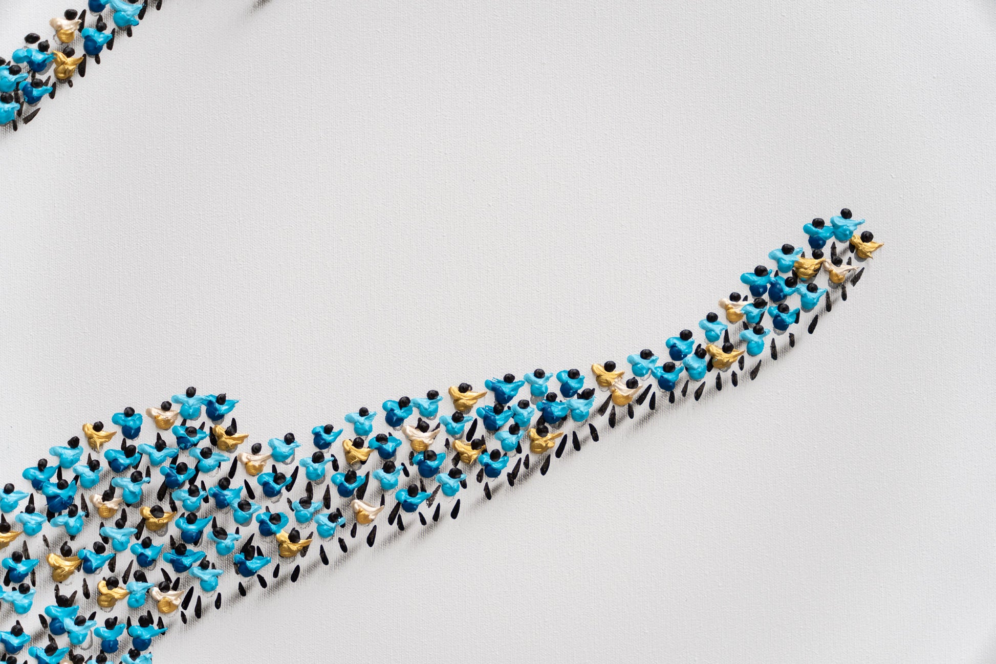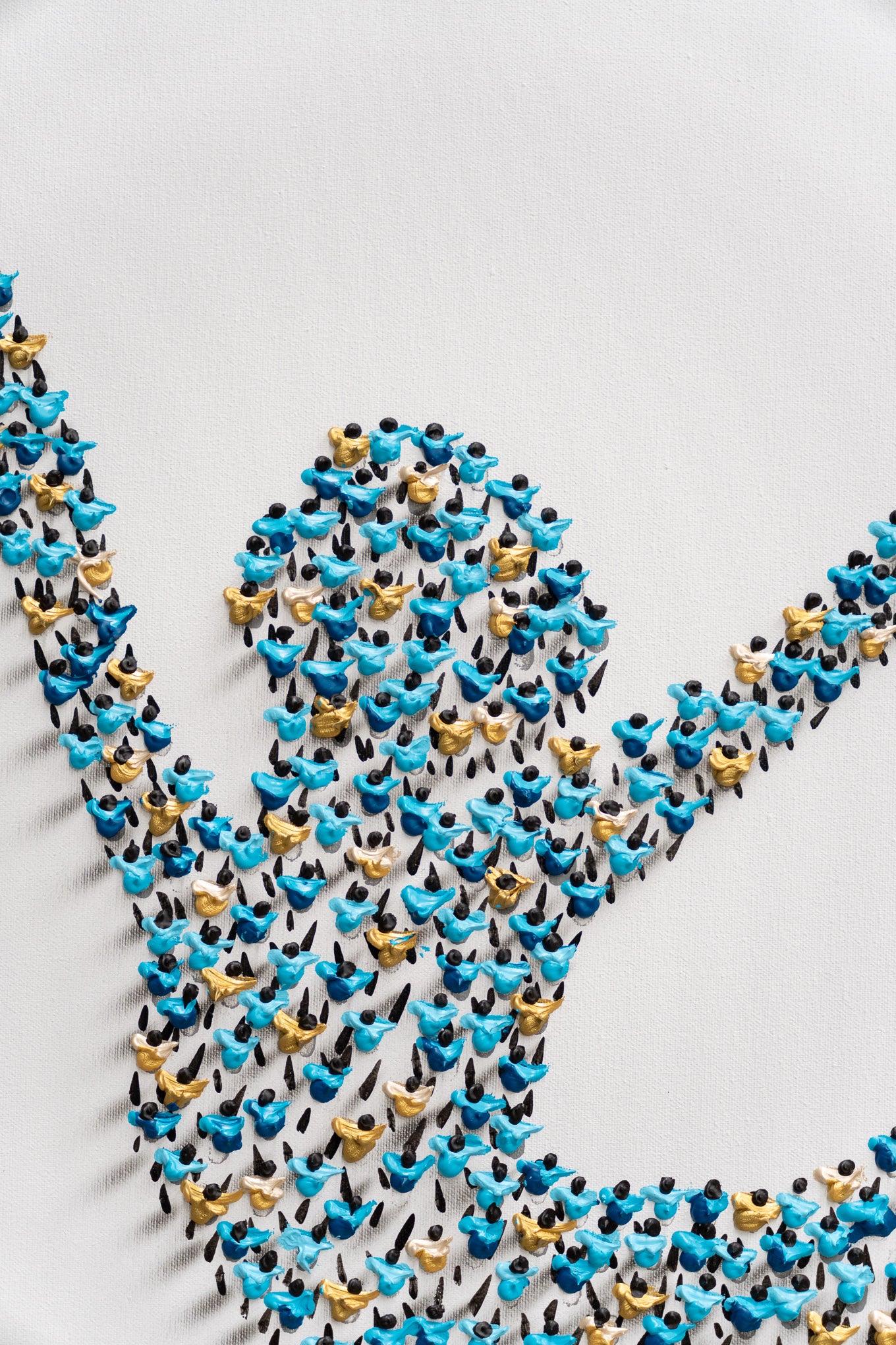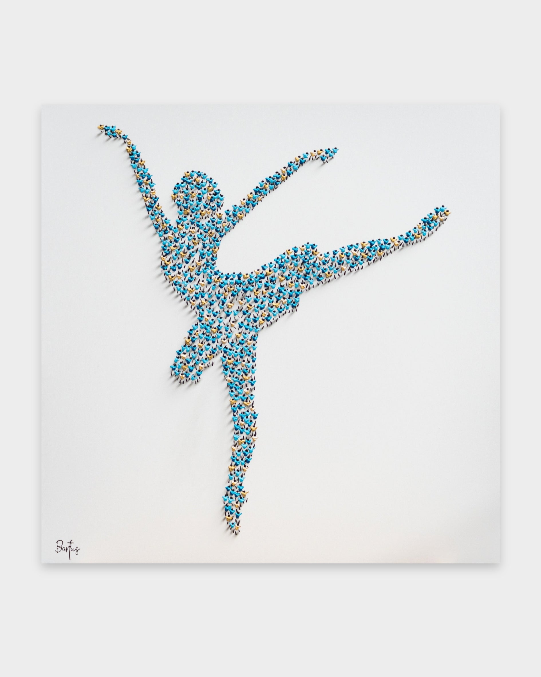 Baigneuse (2025) is a mixed-media painting in which Francisco Bartus depicts a dancing female figure rendered through his distinctive sculptural approach. The silhouette of the dancer is formed by the careful accumulation of small human figures, creating a sense of volume and three-dimensionality. Through subtle contrasts of light and shadow, the work conveys movement and grace, transforming the figure into a dynamic presence that exists between image, structure, and perception.
