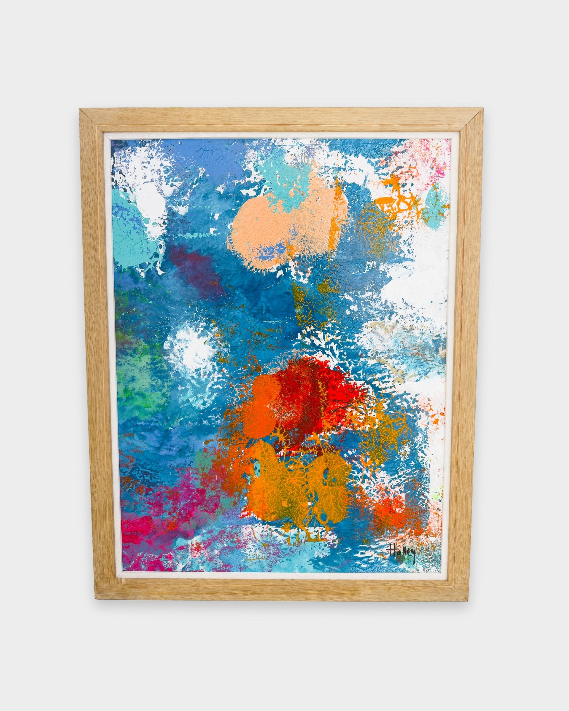 Dit kunstwerk toont een scala aan kleurrijke koralen, weergegeven in een palet van levendige tinten die de schoonheid en diversiteit van het zeeleven oproepen. De speelse vormen en dynamische compositie nodigen kijkers uit om zich onder te dompelen in de onderwaterwereld, wat Halley's kenmerkende stijl benadrukt, waarbij vreugde en positiviteit worden gecombineerd met natuurlijke thema's.