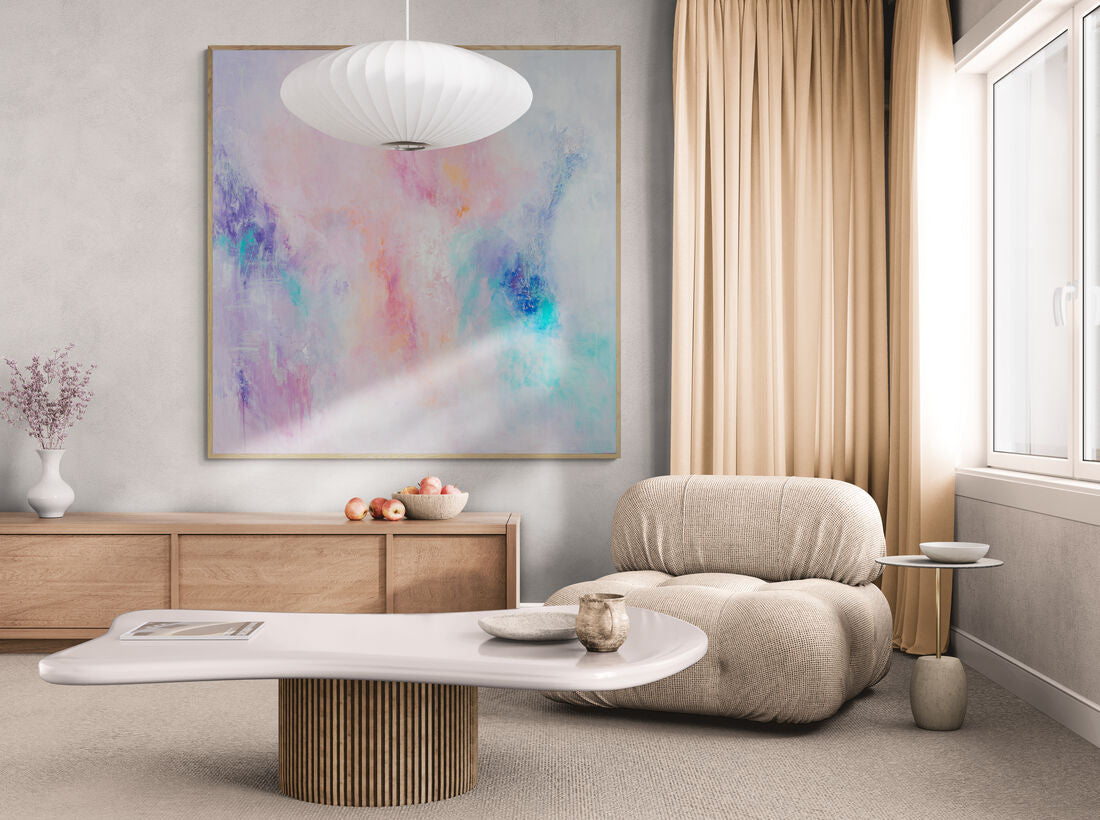 «Heaven» av Covella er et fortryllende abstrakt maleri som fordyper betrakteren i en drømmende visuell reise. Verket, dominert av rosa og turkise toner, viser frem Covellas særegne stil med sine finurlige strøk og dynamiske komposisjon. De nøye utvalgte pastellene og de livlige fargene spiller harmonisk sammen og skaper en rolig, men likevel levende atmosfære. Ulike teksturer og materialer gir dybde og inviterer betrakteren til å utforske de intrikate lagene.