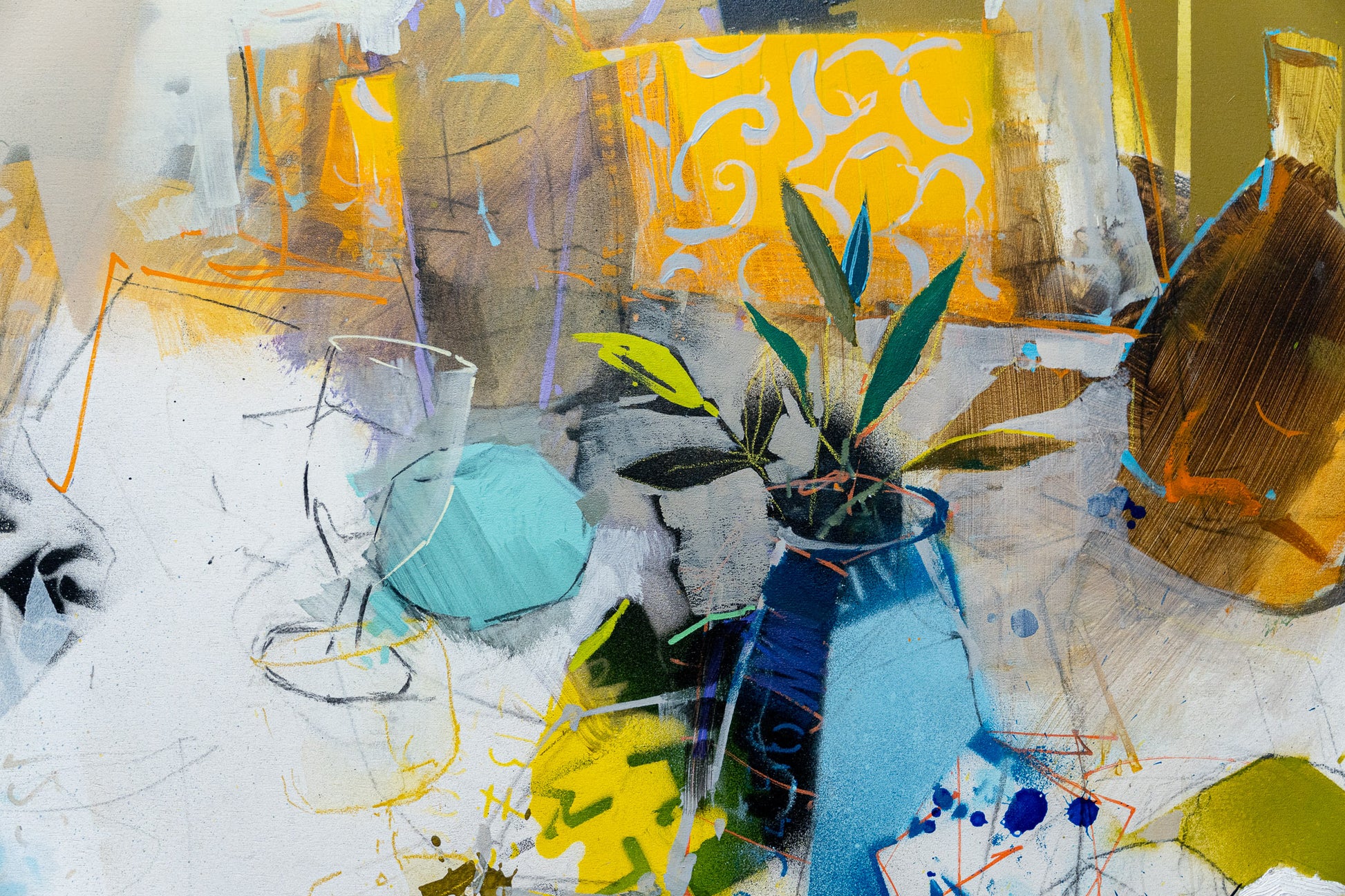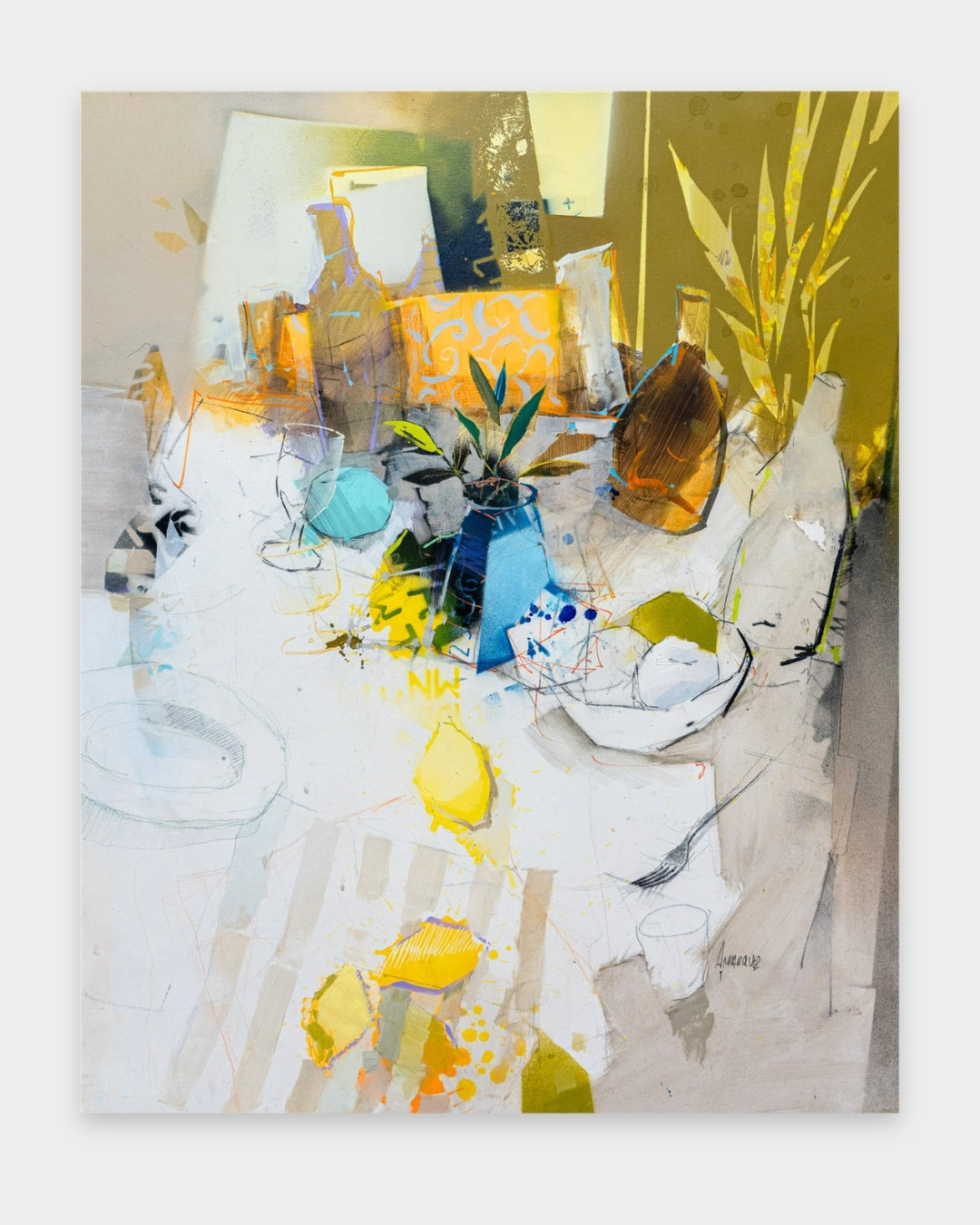 Un limón, medio limón captures the quiet freshness of a simple tabletop scene bathed in warm daylight. Through his use of mixed media, Alberto Márquez constructs the composition with subtle layers of color and texture that give the lemons a natural presence and weight. Their vibrant yellow tones stand out against the softer hues of the table, while the light—suggestive of midday drifting toward afternoon—spreads gently across the surface. The delicate balance of brightness and shadow enhances the sense of calm, turning this modest arrangement into a luminous study of color, light, and everyday beauty.