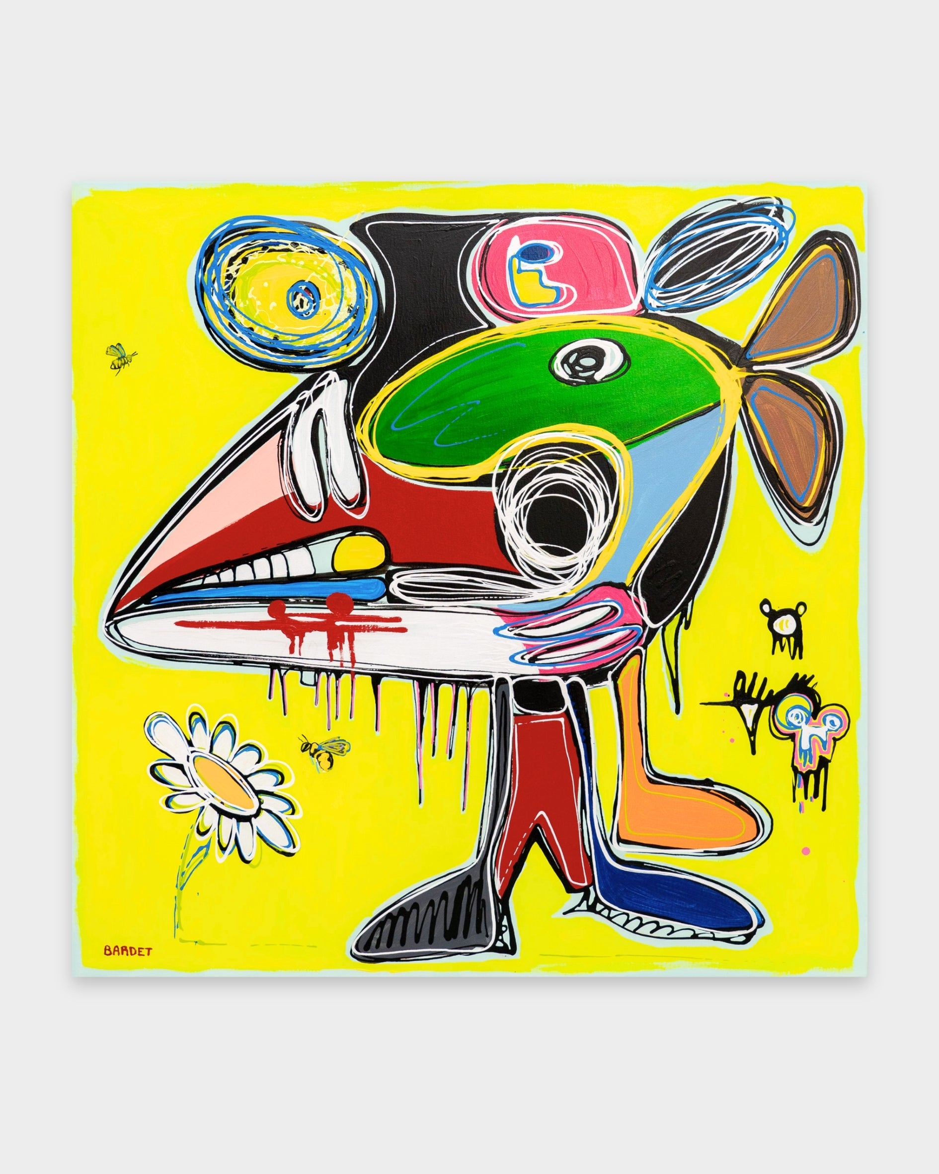 Fantasia IV bursts with bold, vibrant colors, where figurative forms emerge amid energetic brushstrokes. Bardet’s expressive language transforms each canvas into a dynamic interplay of shapes and hues, capturing emotion through both color and figure. The work invites viewers to explore a world where vivid imagery meets raw, human intensity.