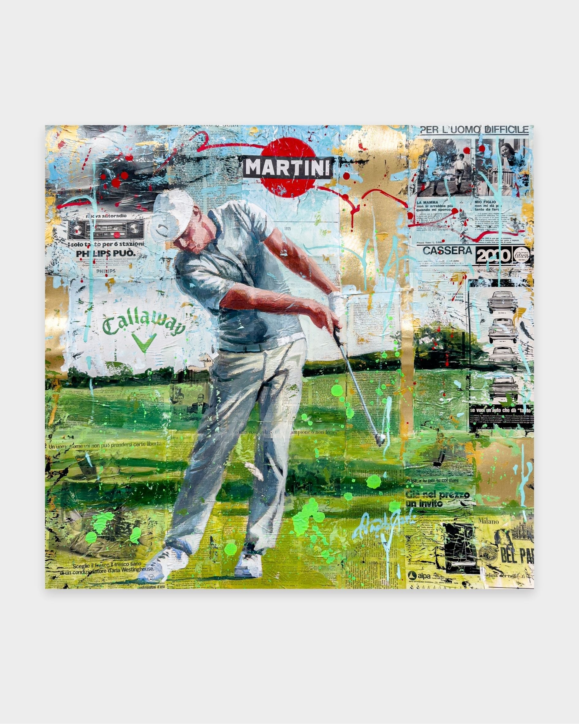 In Green Game Martini, Angela Carli juxtaposes the dynamic presence of a golfer with a backdrop of vintage newspapers, creating a playful dialogue between sport, history, and design. The layered composition and subtle color palette evoke both movement and nostalgia, inviting viewers to explore the intersection of contemporary life and past narratives. This work highlights Carli’s distinctive approach to combining figurative elements with textural and graphic depth.