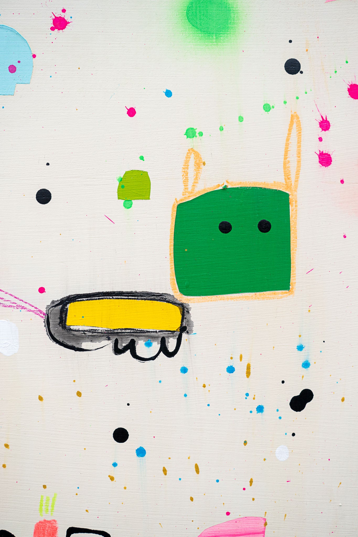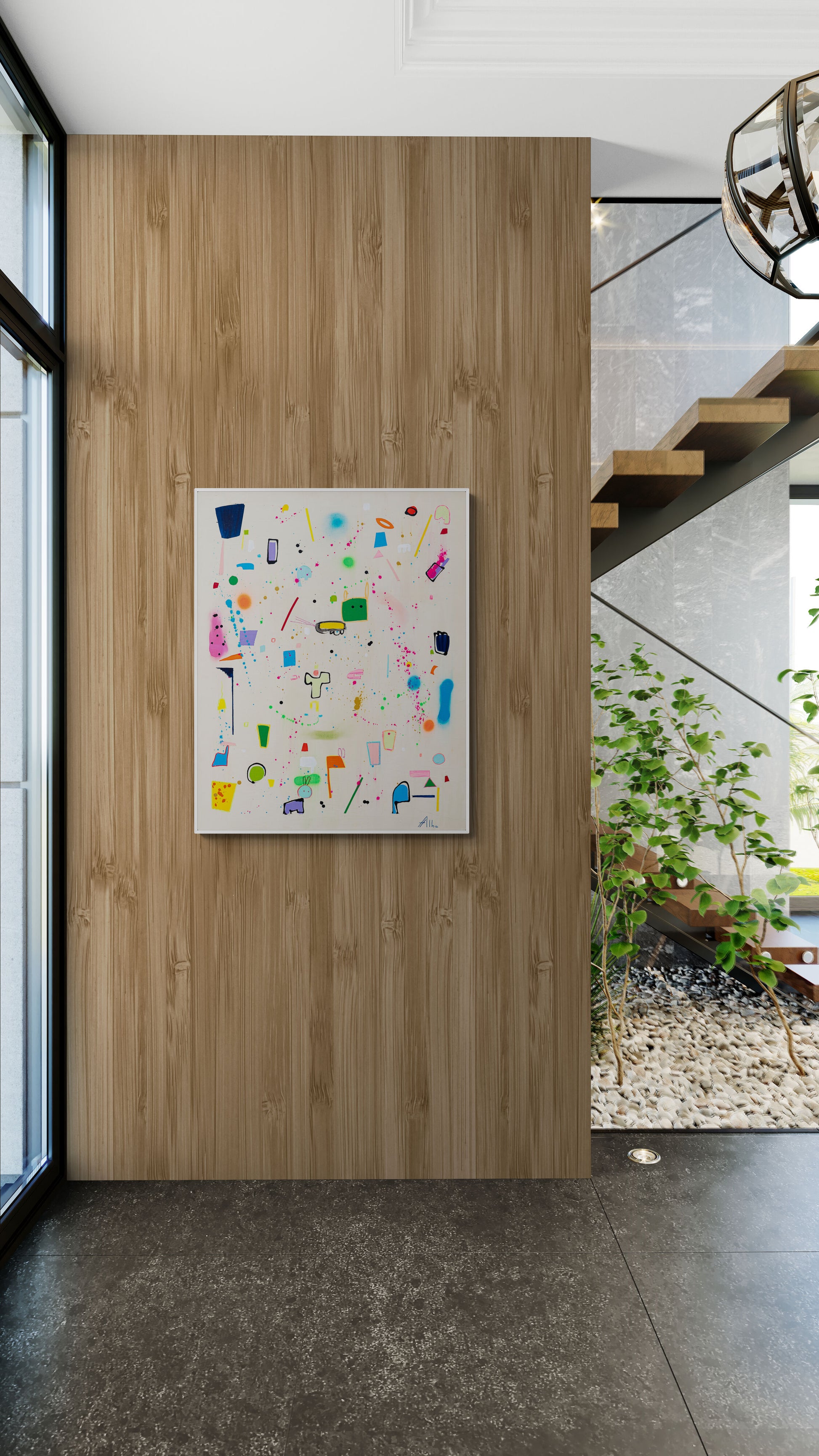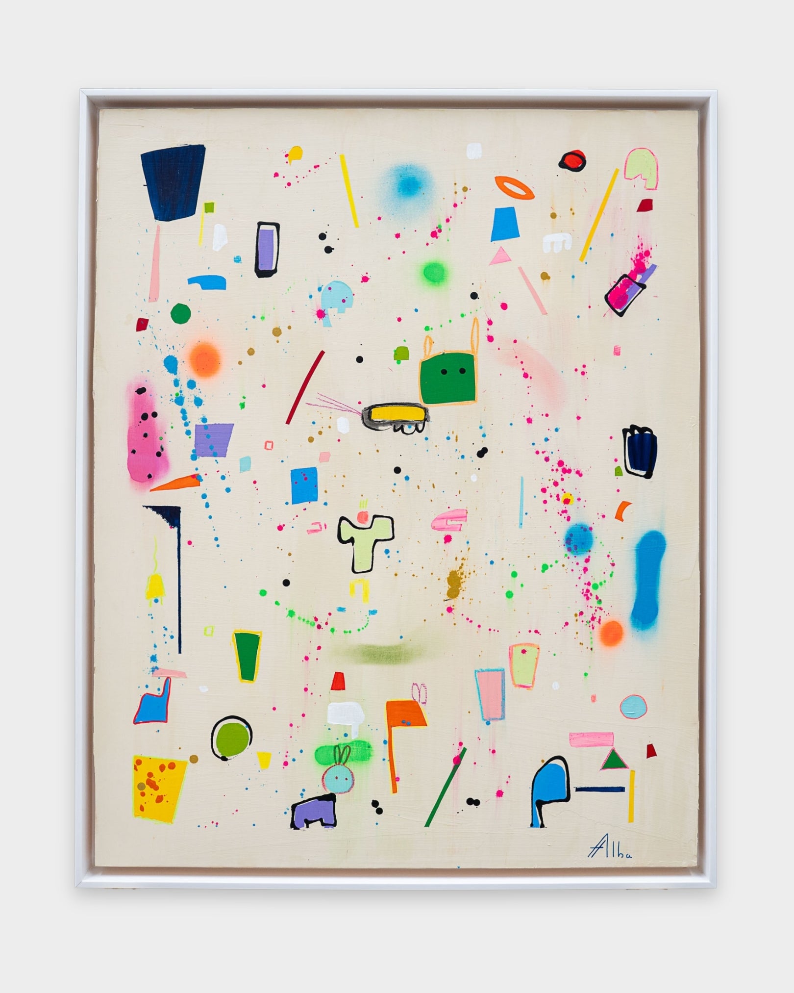 In Juegos traviesos, Manel Alba explores spontaneity, color, and movement through a joyful constellation of abstract forms and playful gestures. The artist combines precise lines with splashes of vibrant pigment, creating a dynamic balance between control and improvisation. The result is a work that feels both intuitive and deliberate — a celebration of creativity, imagination, and the childlike freedom that defines Alba’s visual language.