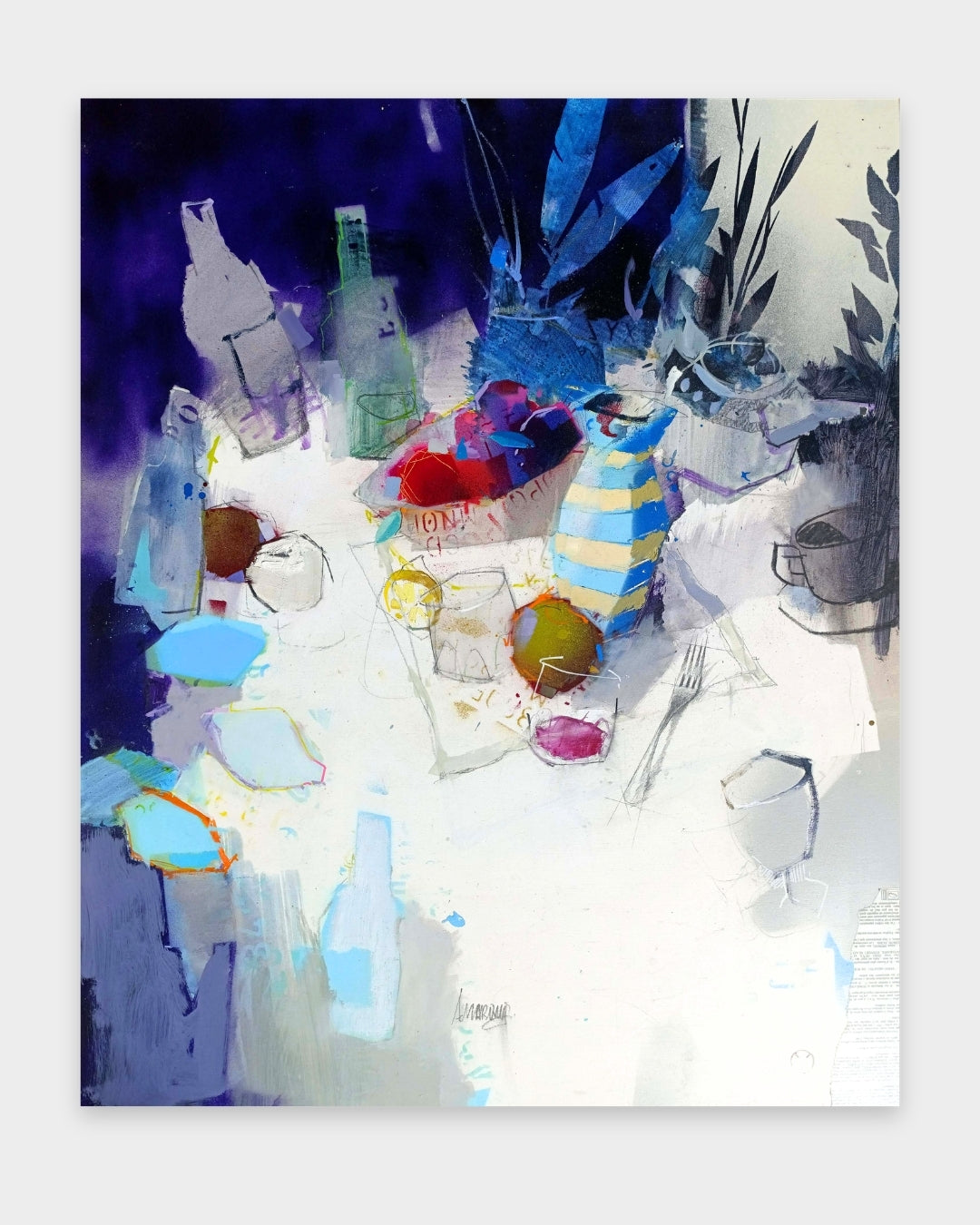 Noches de verano evokes the quiet warmth and gentle stillness of Mediterranean evenings. Through his use of mixed media, Alberto Márquez builds the composition with layered textures and subtle tonal transitions that give the scene depth and presence. The interplay of soft shadows and delicate highlights suggests the lingering light of a summer night, when everyday moments unfold slowly around the table. With restrained yet expressive brushwork, Márquez captures an atmosphere of calm and intimacy, transforming a simple setting into a poetic reflection on light, season, and memory. ✨