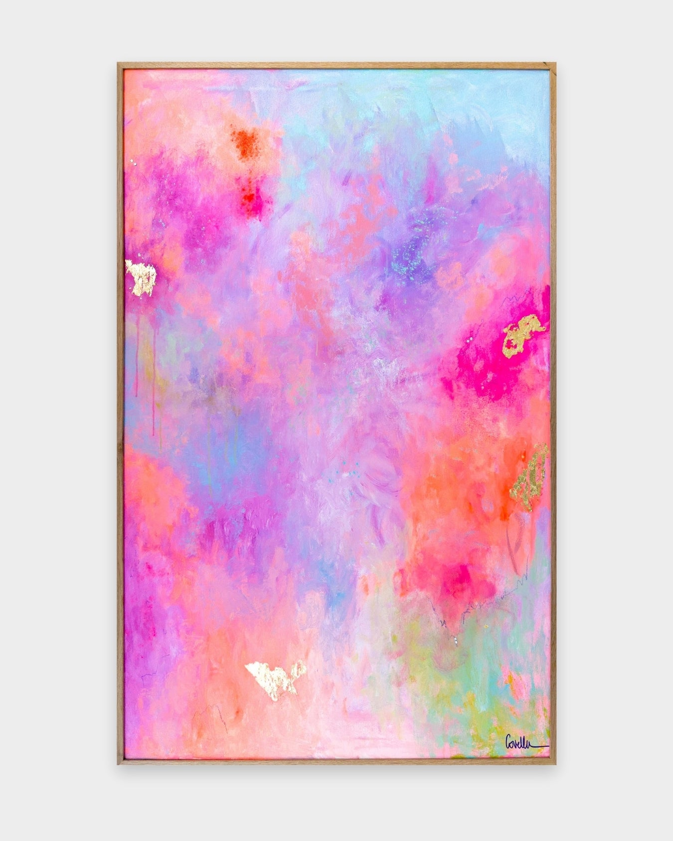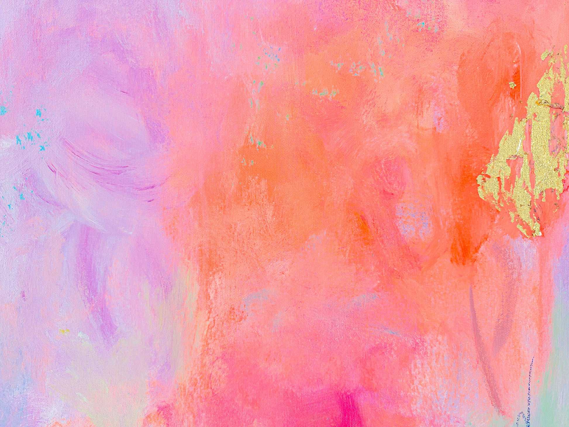 The composition unfolds like an abstract landscape bathed in sunset light, where pinks, lilacs, fuchsias, and oranges blend and layer fluidly. Touches of fluorescent colors intensify the visual energy of the piece, adding a modern glow that seems to vibrate with the surrounding light.