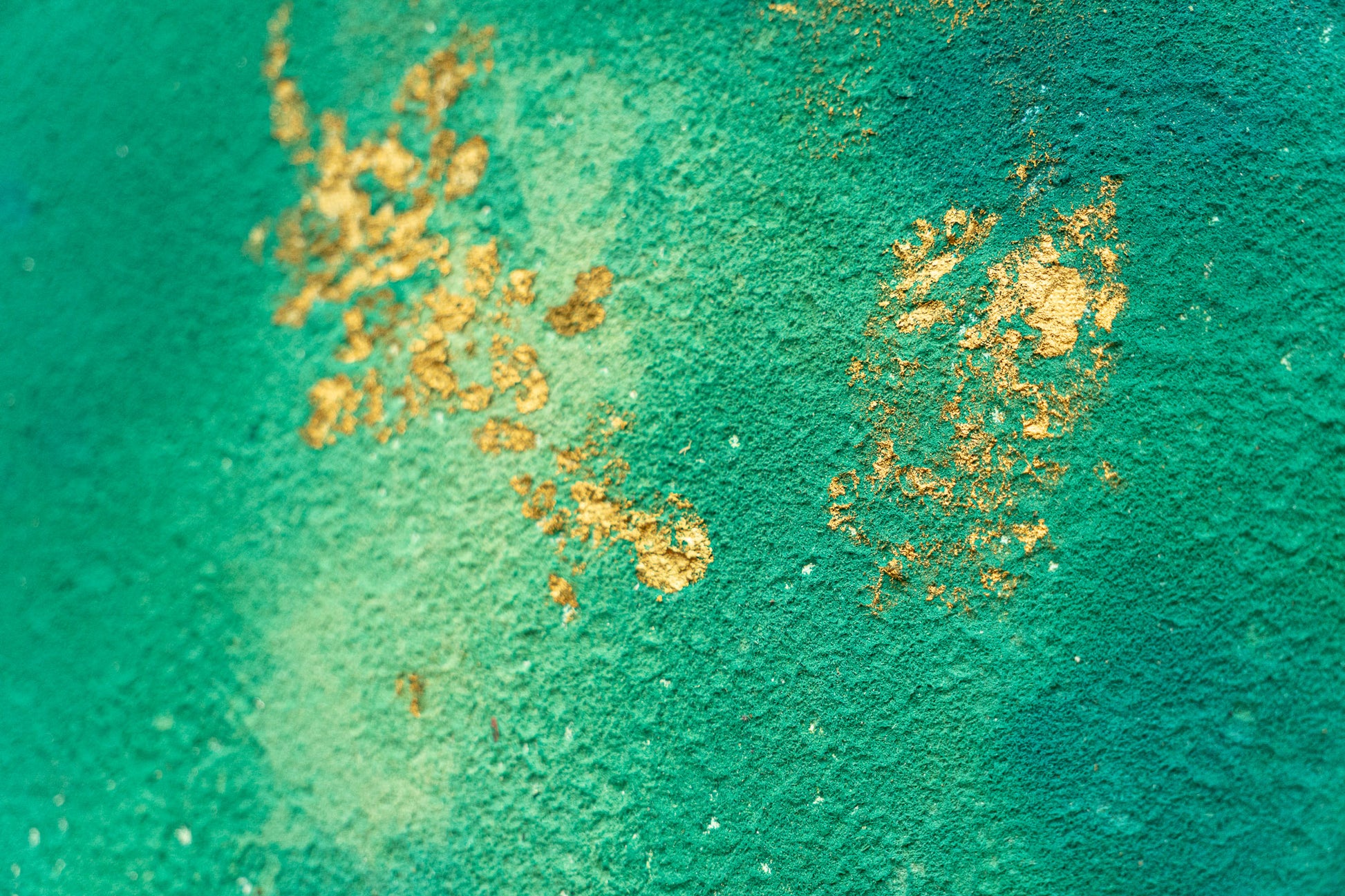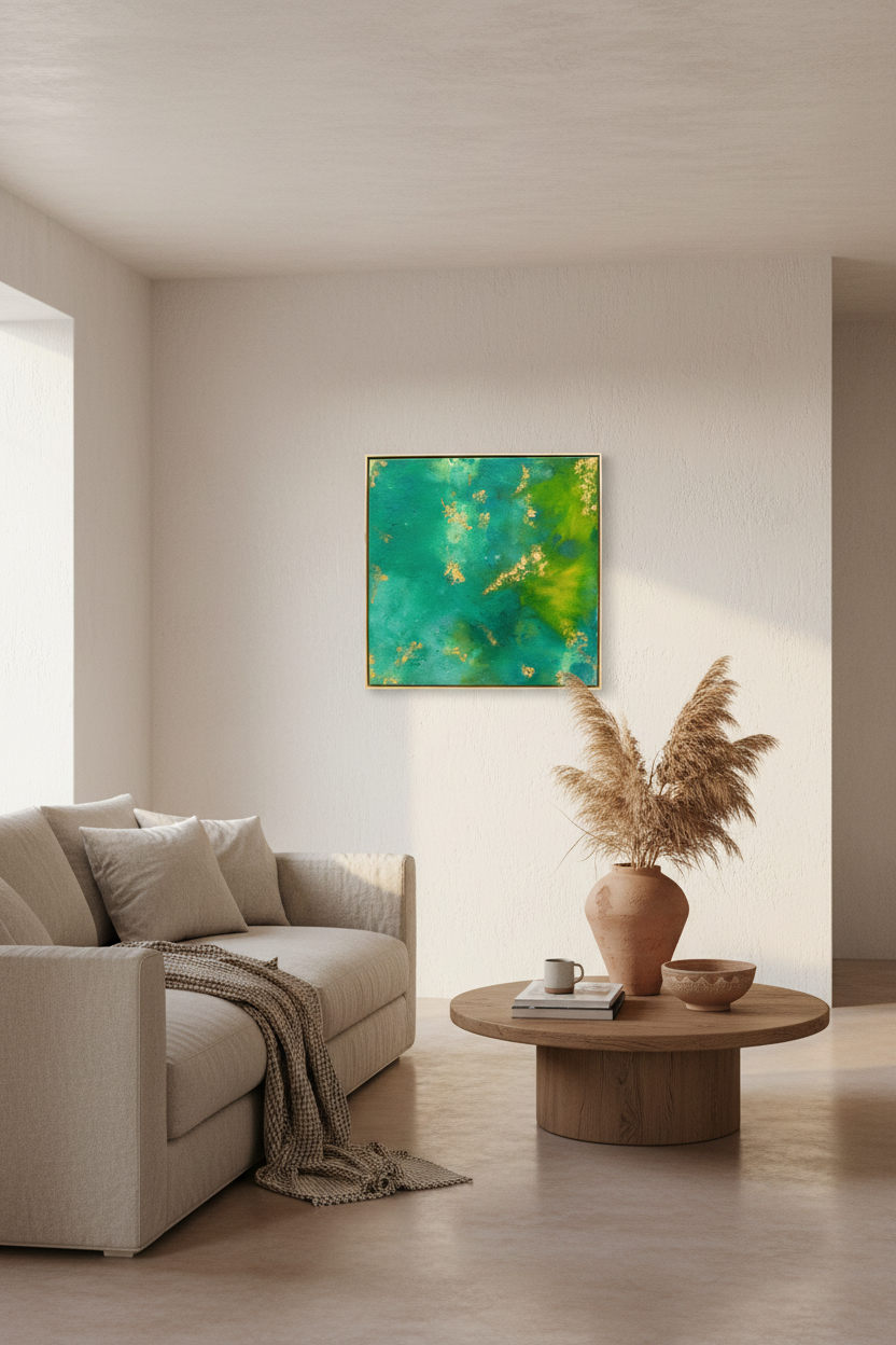 Composed of vibrant greens and turquoise hues, this work presents a dynamic surface animated by delicate golden accents. Color and texture interact to create a sense of movement and depth, recalling abstract natural environments.