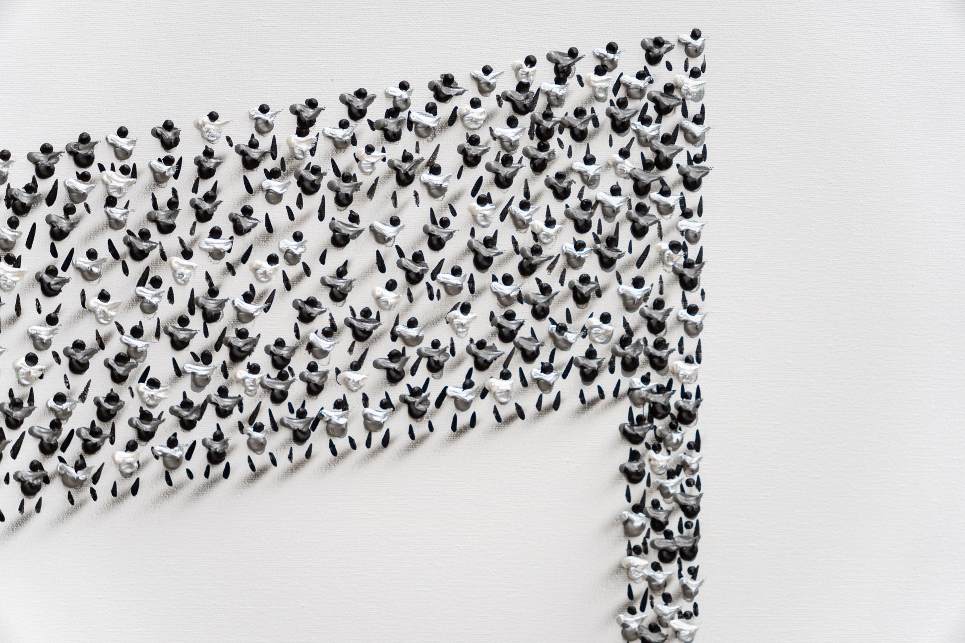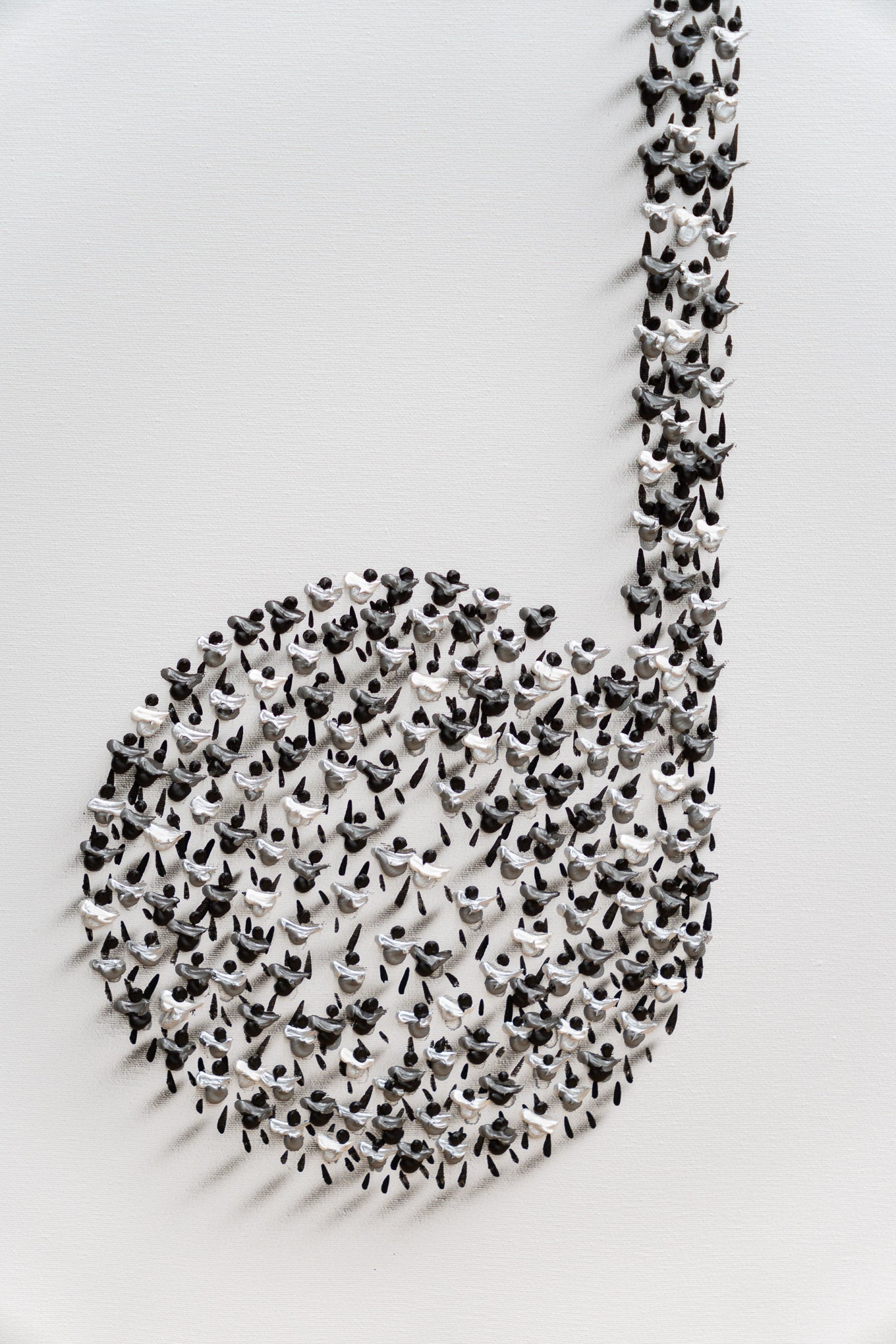 Francisco Bartus represents a musical note through his distinctive visual language. The silhouette of the quaver is constructed from numerous small human figures, meticulously arranged to generate a pronounced three-dimensional effect. Through the interplay of volume, shadow, and repetition, Bartus transforms a simple musical symbol into a dynamic sculptural form, exploring the relationship between rhythm, structure, and visual perception.